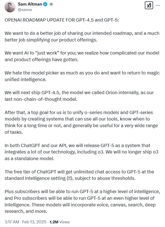 凌晨3点,AI界直接被OpenAI首席执行官Sam Altman投下的“核弹”炸醒,GPT-4.5和GPT-5的消息重磅席来,整个AI领域瞬间沸腾。先说说GPT-4.5,也就是内部代号为猎户座模型(Orion)的它,被Altman官宣为最后一个非思维链模型。