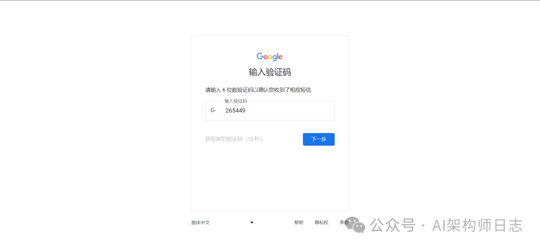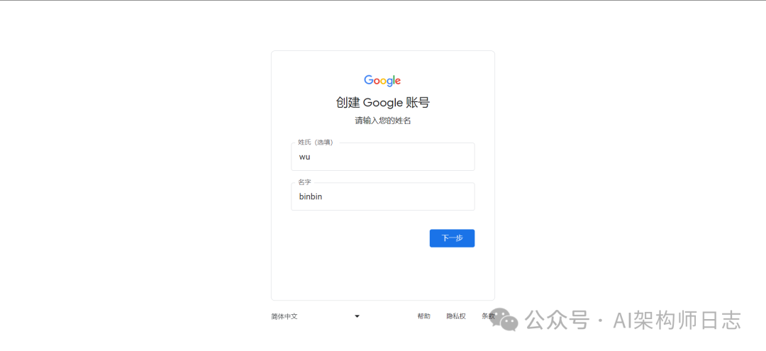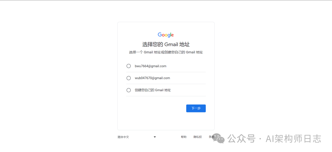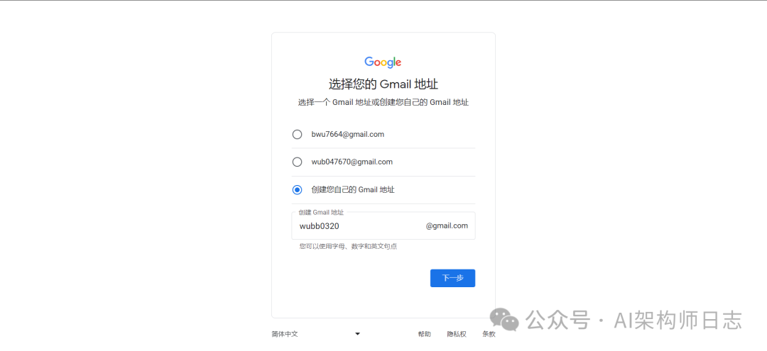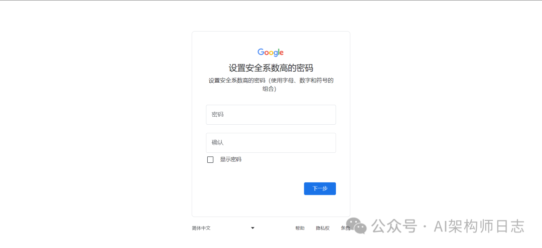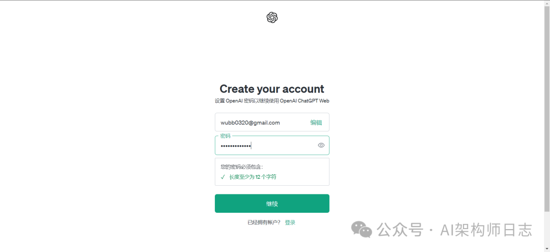 这里直接输入gmail邮箱账号,点击继续后,填写12位的以上的密码