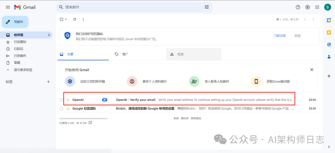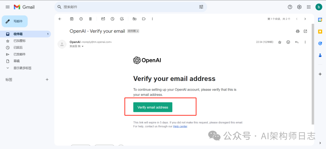 接着会让我们使用gmail邮箱进行验证。点击Open Gmail会自动跳转到Gmail邮箱,我们找到验证邮箱那条记录