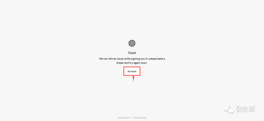 5.以下是可能遇到的问题,这种情况大概率是你的网络环境不稳定导致的,但并不影响注册的结果,这个情况不用管,直接回到OpenAI主页(chat.openai.com/auth/login)点击Login登录即可继续进行操作。