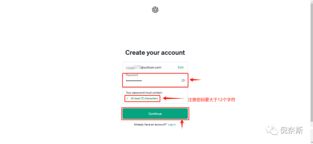 3.输入密码,注意密码要大于12个字符,点击Continue下一步。