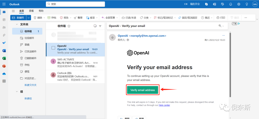 4.在微软邮箱打开验证邮件,点击Verify email address。