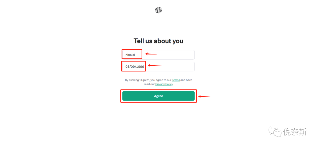 11.输入名字和出生日期,同样注意年龄要大于18岁,点击Agree下一步。
