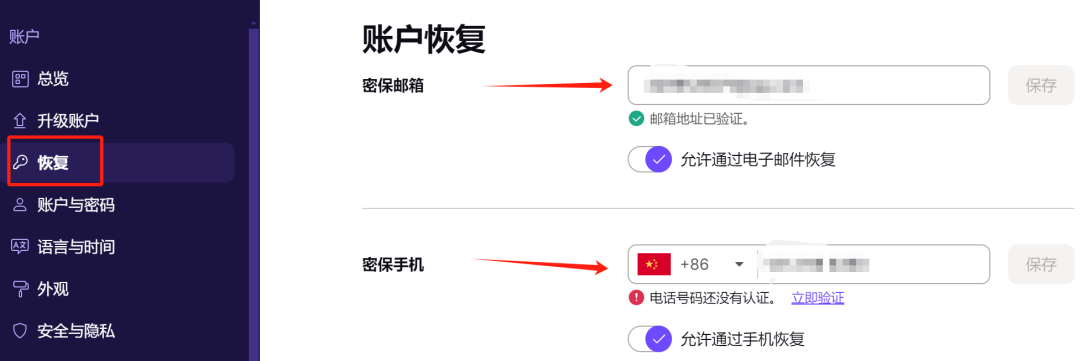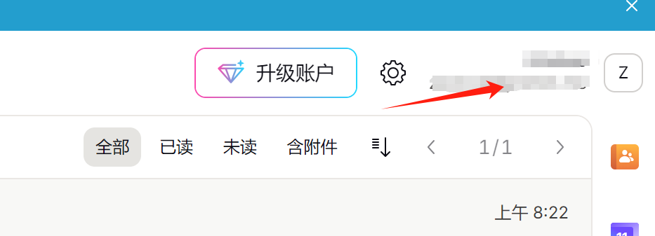 4、进入邮箱后,点击右上角的邮箱地址,点击设置。在设置界面,选择恢复选项,设置账户恢复,密保邮箱需要进行验证,可以是QQ邮箱。密保手机可以写中国手机号,但不用验证,也验证不了。