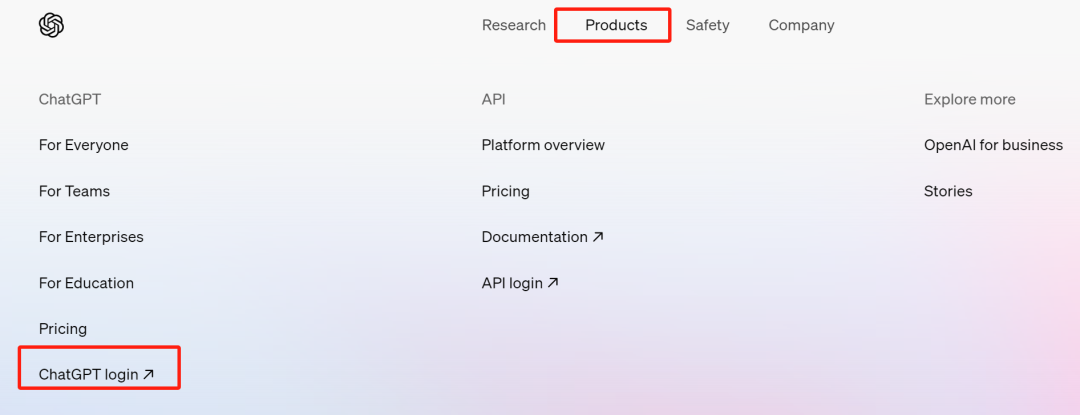 2、打开OpenAI官网(https://openai.com/),在Products中选择ChatGPT login。