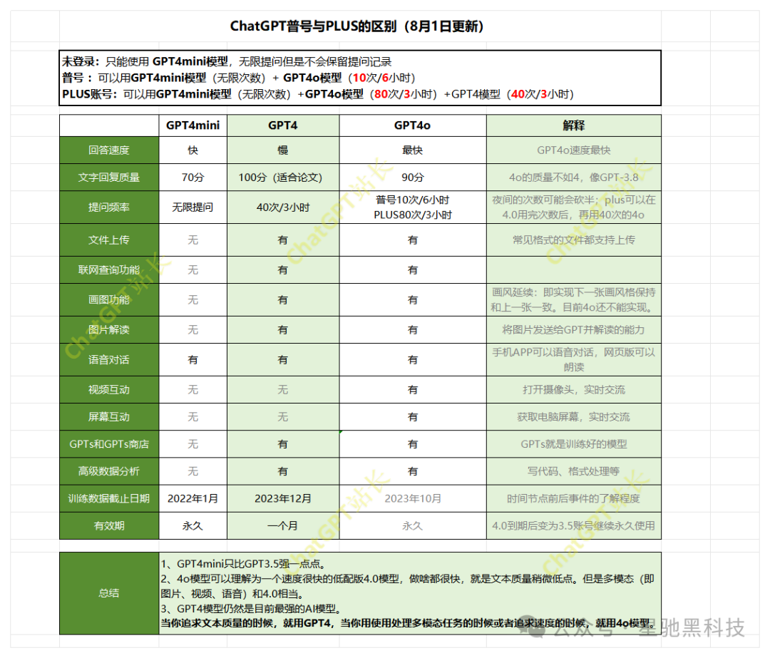 每个模型的区别,站长用一张图总结了出来。ChatGPT要不要充值PLUS?看完这张图你就明白了。