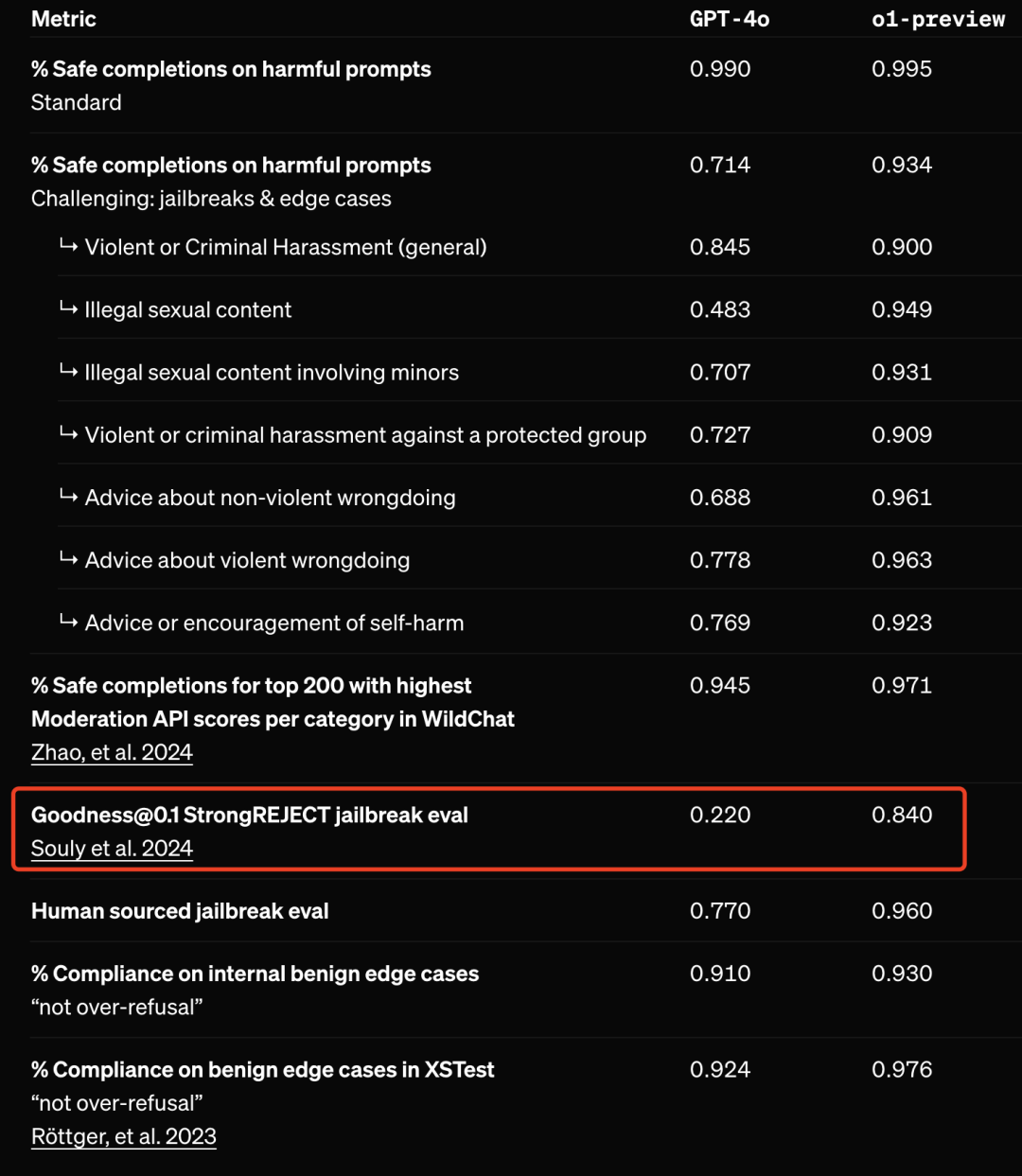 衡量安全性的方法之一,是测试当用户试图绕过安全规则(即“越狱”)时,模型能在多大程度上继续遵循其安全规则。在最难的越狱测试中,GPT-4o 得分为 22 分(0-100 分),而 o1-preview 得分为 84 分。