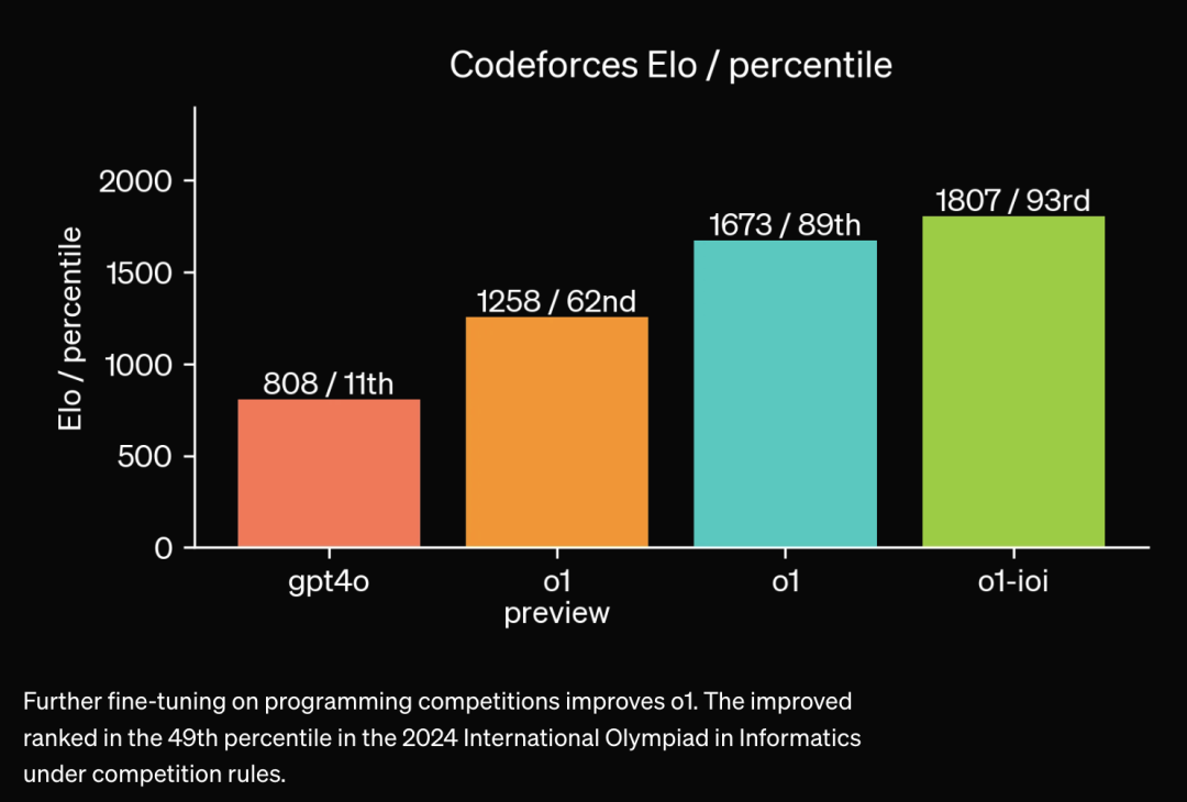 此外,o1 模型的编码能力也在竞赛中得到了评估,在 Codeforces 竞赛中达到了第 89 个百分点。