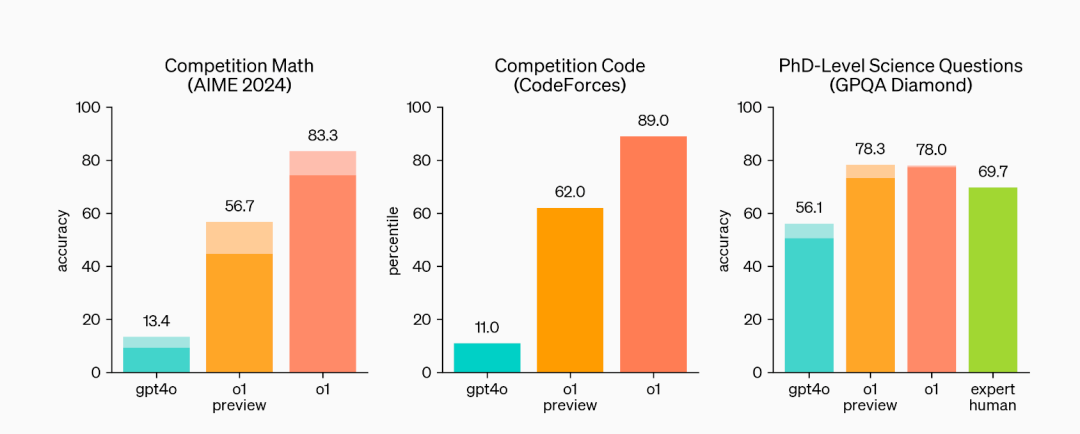 在物理、化学、生物学科中的表现达到了博士生水平,人类专家的分数是 69.7 分,而 o1 的分数达到了 78 分!已经超过人类专家!