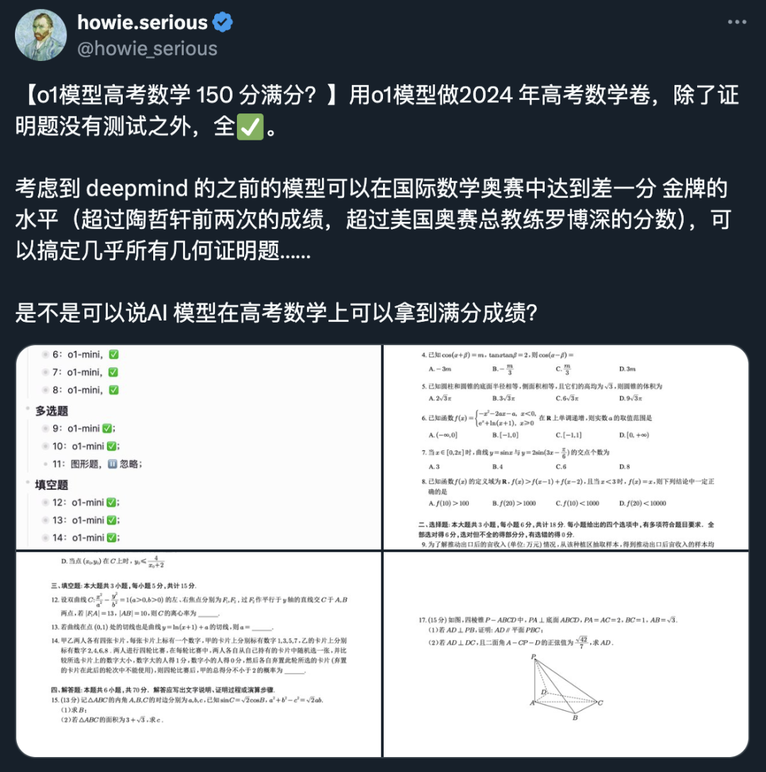 模型智能水平更有说服力的证据,是网友 @howie_serious 用 o1 测试今年的数学高考题,结果竟然全对。