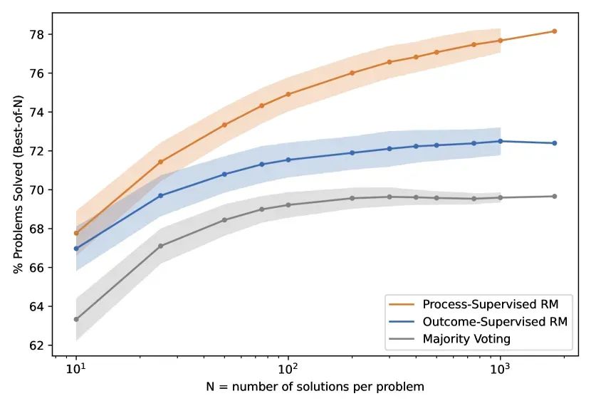 2.在解决具有挑战性的数学问题时,过程监督显著优于结果监督(见图)