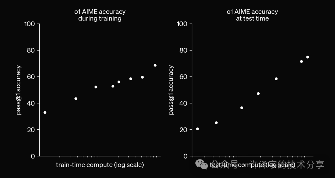 在这张图表中,OpenAI 展示了在 AIME 上准确性和测试时计算量之间的对数线性关系。换句话说,随着计算量的指数增长,准确性线性提高。