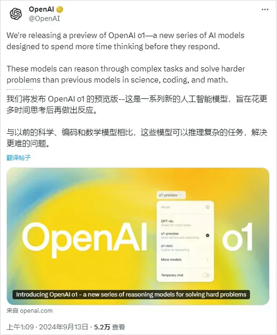 CEO 奥特曼表示,此次 o1 模型推出,标志着一种新范式的起点:具备通用复杂推理能力的人工智能。