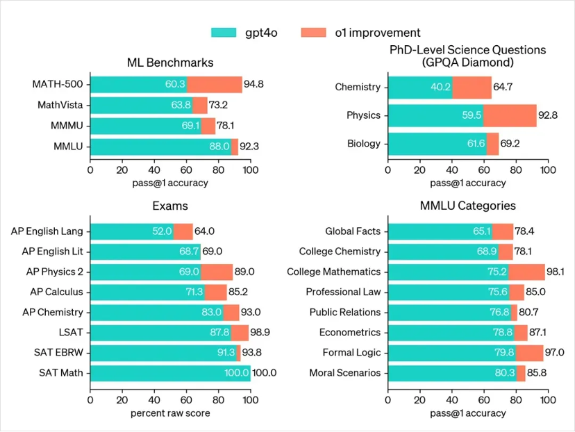 在博士级科学问题的 GPQA Diamond 评测中,GPT4o 的正确率为 56.1%,人类专家则为 69.7%,而 o1 则显著提升至 78%。