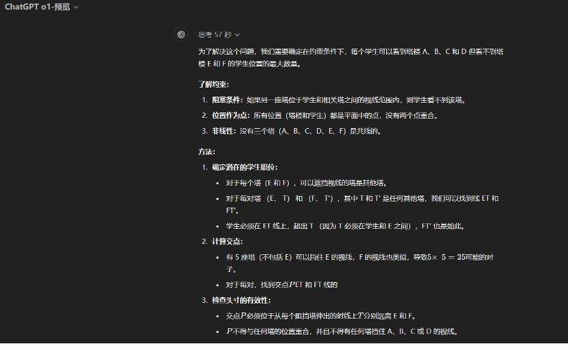 o1 给出的答案正确,而且推理的过程也十分完美,不过就是推理时间长达 3 分钟