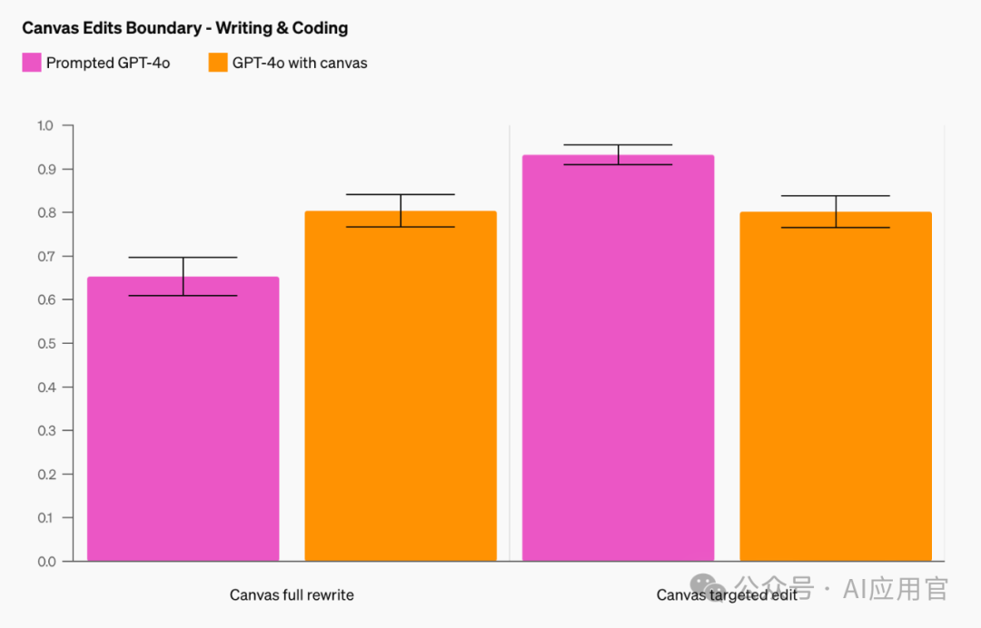 在写作和编码任务中,我们优先改进了针对画布的编辑。带有画布的GPT-4o的表现比基线提示GPT-4o高出18%。