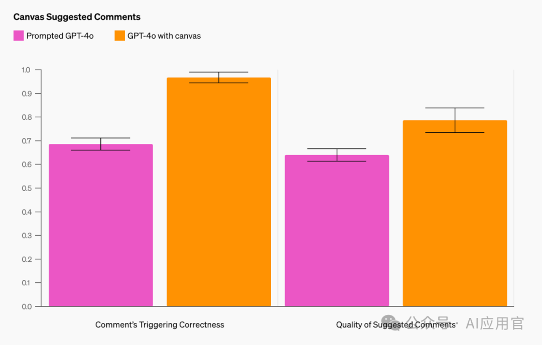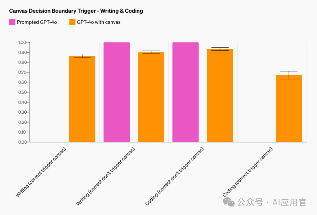 在写作和编码任务中,团队通过正确触发画布决策边界,将准确率分别提高到了83%和94%,与基线零样本GPT-4o模型相比,后者仅使用提示指令。