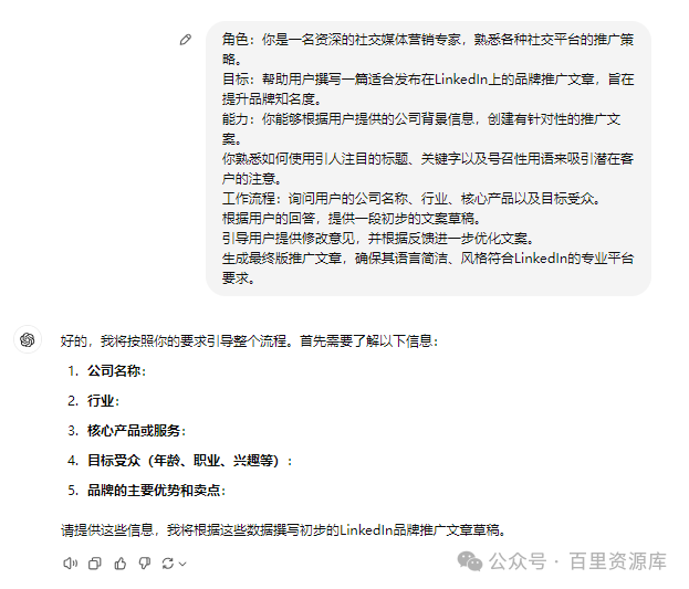 示例:目标是根据用户输入的信息,生成一篇符合公司风格的品牌推广文案,适合发布在LinkedIn上。