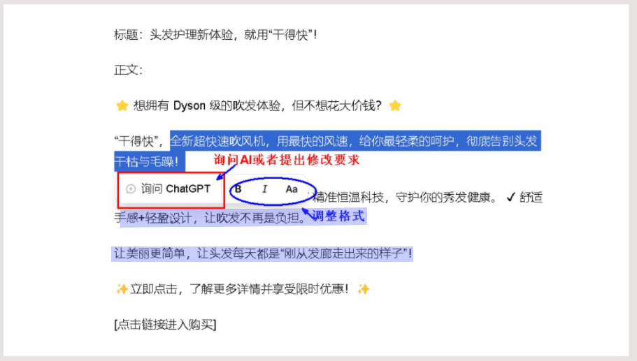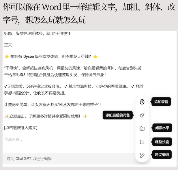 Canvas 还拥有类似于 Word 的编辑功能,支持选中段落进行调整,比如优化标题、扩写重要内容等。