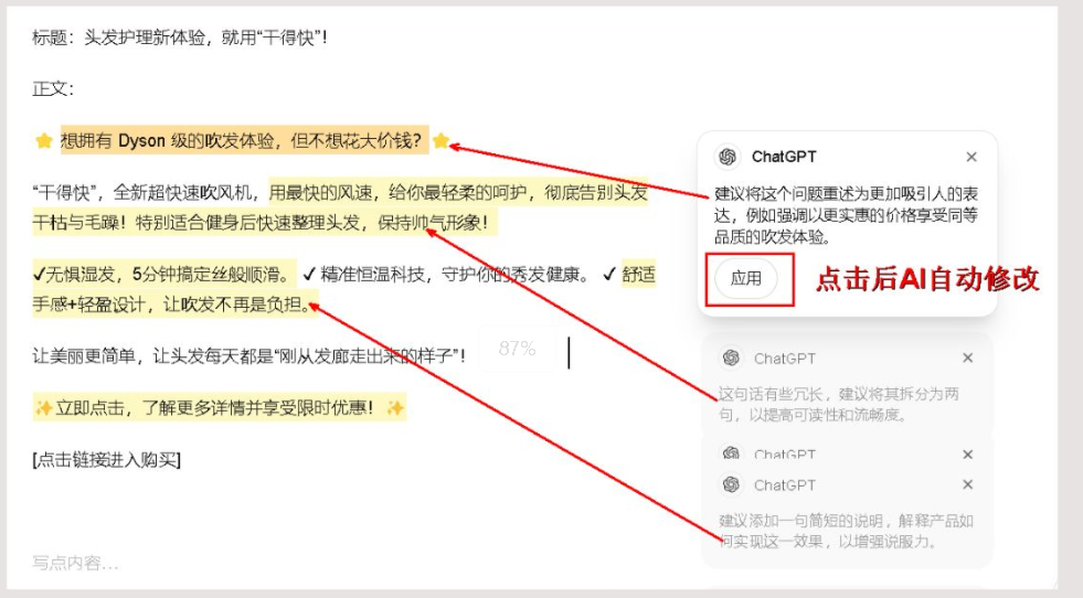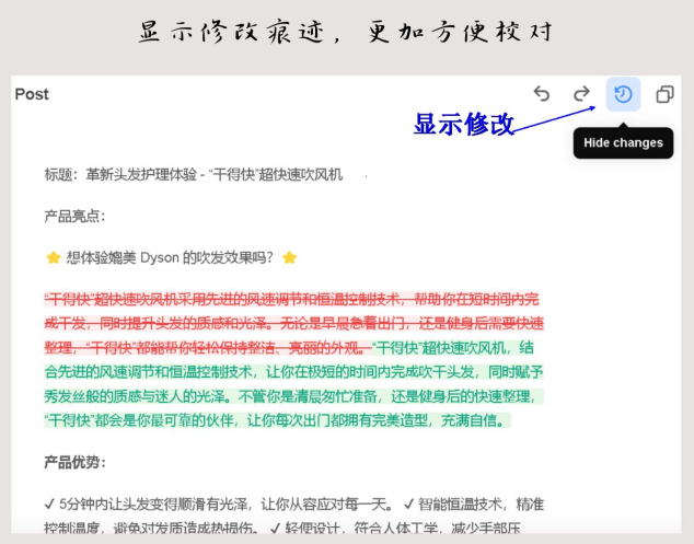 它提供了一个固定的文章窗口,左侧输入调整指令,右侧展示固定文章内容,让你专注修改,不再被冗长的对话打断。