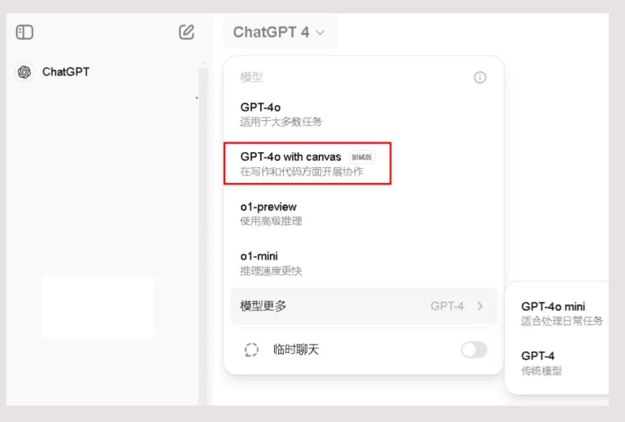 只需在 ChatGPT 界面左上角选择“GPT-4o with Canvas”,便可进入一个革新性的写作模式。
