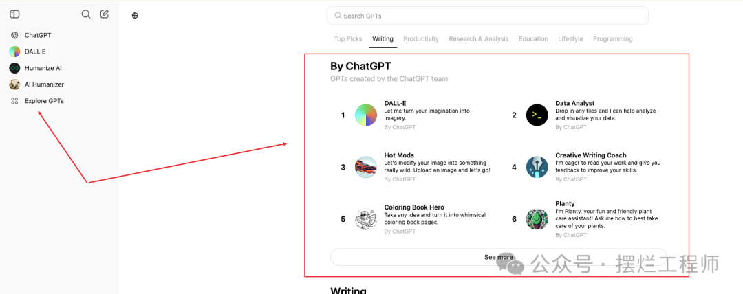 不过,在降智的情况下,还是可以使用GPTs应用,比如DALL-E可以进行绘画,分析文件和图片都也有对应的GPTs应用,可以使用ChatGPT团队开发的。