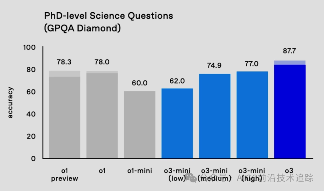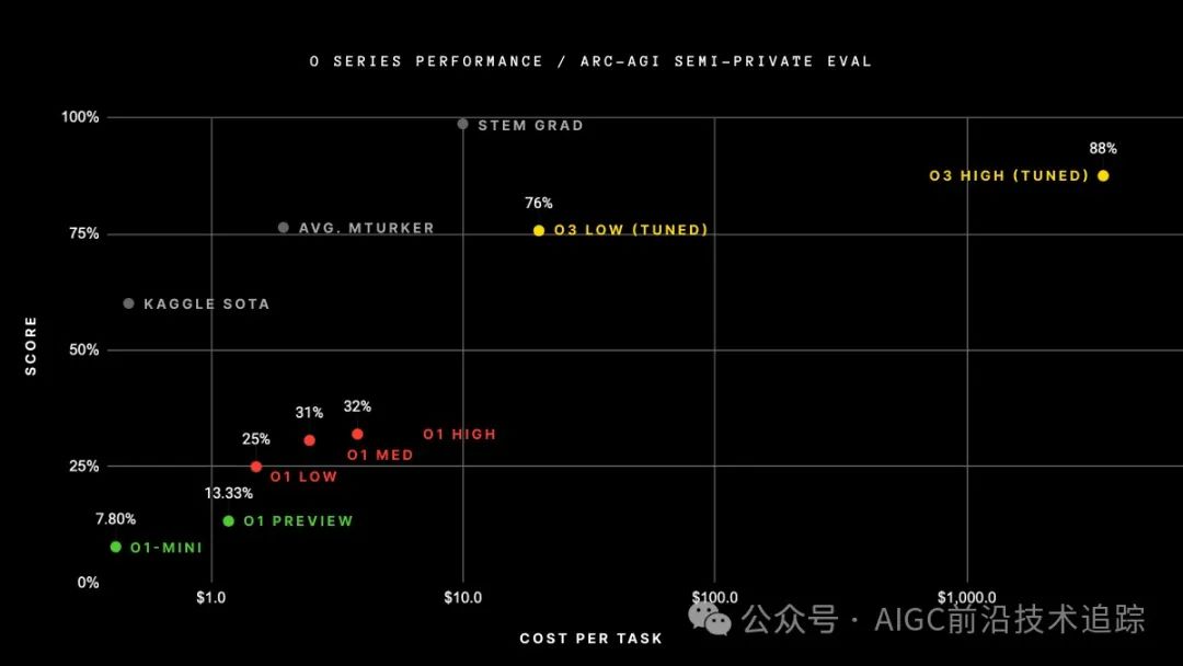 在为AGI(通用人工智能)准备的测试ARC-AGI上,o3更是取得了令人瞩目的成绩。其分数从之前的32%大幅跃升至75.7%和87.5%(分别对应低思考程度和高思考程度设置)。ARC-AGI是由 Keras 之父François Chollet 发起的测试基准,主要包含图形逻辑推理等典型题目,这类题目对于AI的逻辑思维和抽象推理能力是一个极大的挑战。o3在该测试中的优异表现,表明其在逻辑推理和智能决策方面取得了重大突破,向着通用人工智能的目标迈出了坚实的一步。