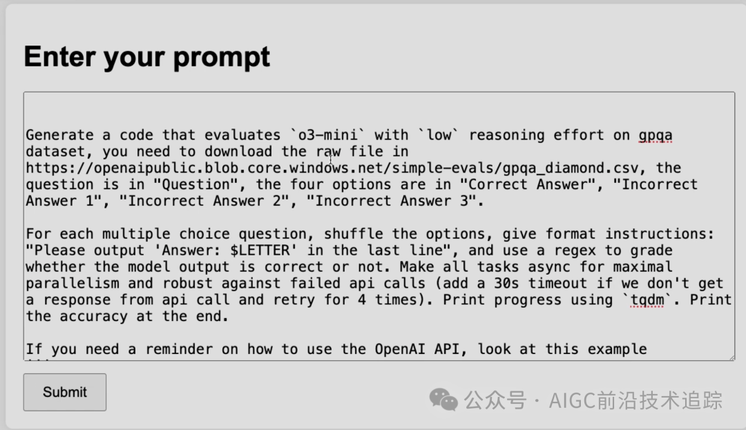 后续,任泓宇还要求 o3-mini 在这个 UI 中编写并执行一个脚本,来评估其在低思考程度下、在 GPQA 数据集上的表现,脚本正确运行评估并返回结果数值 61.62%,与正式评估结果基本一致。这一系列操作充分展示了o3-mini不仅能够快速生成高质量的代码,还能通过API调用实现自我交互和评估,具有很强的自主性和智能性。