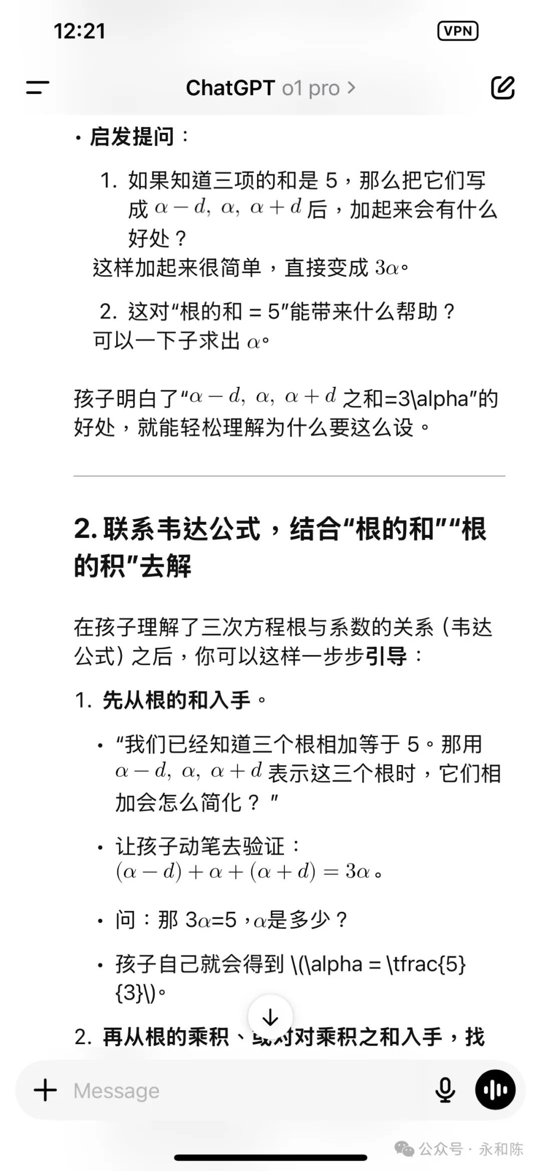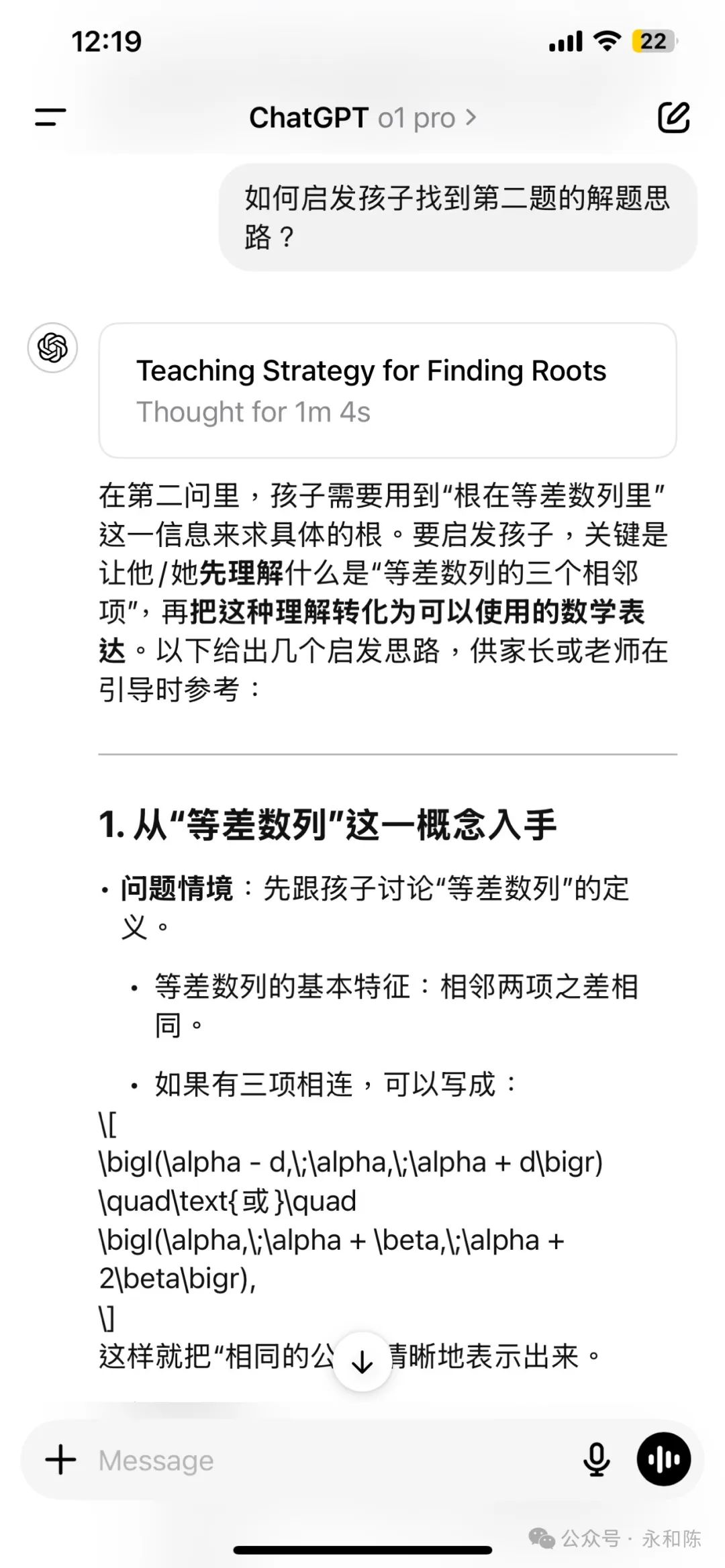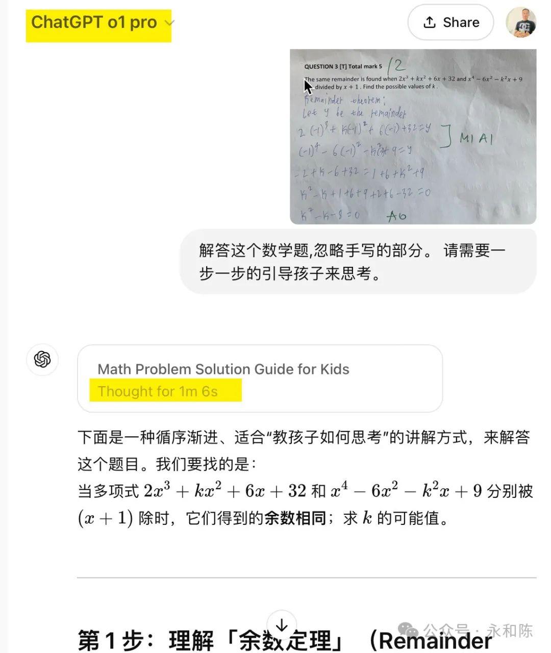 昨天晚上参加老大学校的 Parents' Night,学校专门跟家长解释大学申请的问题。老师特别强调了一点,再过9 个月,就是今年的 10 月份,就可以开始大学申请了。其实也不是担心儿子没有准备好,是我担心儿子的数学能否达到他期望的美国顶尖大学的水平。因为他心仪的学校都是顶尖的理工类,这些学校对数学的要求自然是很高的。儿子自己其它学科都不担心,只是告诉我数学难度比较大。就剩下几个月了,数学再不拿到 7 分,这申请美国顶尖学校的理想就很难实现了呀。我之所以担心,是因为我不知道儿子在数学上的难点在哪里。毫不惭愧地说,我的数学在大学毕业之后就还给老师了。这些年,还得渣都不剩。我之所以毫不惭愧,因为我相信大多数家长也都是这个情况。反正你也不能笑话我。当然像概率、线性、指数型、正态分布等,这些在商业中常用的,我也没丢掉。于是现在出现一个问题,儿子的数学功课,我就没法辅导了。甚至,我连老师的评语都看不懂。都是简写,好像看医生的药单。因为看不懂,所以我就焦虑了,孩子的数学到底在哪个水平,到底欠缺了什么?青春期的儿子跟父母表达本来就惜字如金,他一直告诉我,都很好。人对于不懂的、未知的,就会脑补,就会想象,这个都很好,到底是多好?在我的建议下,儿子早就用 AI 来指导自己的数学了。而且,他觉得特别有帮助,因为 AI 能够及时指出他在哪些基础的地方有欠缺,当场就给他讲解,然后,再附加几个练习题训练一下。还是得请 AI 帮忙,看看能不能让我分析出儿子的数学到底有多好。于是我把儿子的考试结果翻出来,把儿子做错的这道题,5 分只得了 2 分,拍照,传给 ChatGPT。为了确保我得到最可靠的答复,我还专门选择了 O1 Pro版本。就是那个每个月200美金的订阅费,智商达到139的,博士水平的版本。O1 Pro 思考了1 分钟零 6 秒之后,给出了逐步解答。但是不耽误,我知道了它的框架,就是使用这个余数定理来解题的过程。这样,我再去看儿子的解题过程,我就知道了他没有得满分的原因。其实当初儿子给我解释这道题的时候,就明确说过他粗心了。现在我知道问题在哪里了,我就狠狠的在试卷上做了个标注!我决定挑战当时儿子觉得最难的题目。7 分的题,只得了 1 分。我等儿子放学回来,看看他对 AI 的解题思路有什么看法。因为只要儿子的基础没问题,剩下的就是锻炼解题思路。虽然我依然看不懂定理或者公式,但是有 AI 这个博士级别的“家教”在手边,我觉得踏实了很多。不管问题多难,我都有最聪明的 AI 辅导孩子的功课。我感觉,他们的数学,解题思路并不难,只要把知识点用对了,得高分是是不难的。我的信心,就来自于我花了这半天时间,在 AI的帮助下,搞懂了他们的数学题到底是考什么的。在这个视频里面,我分享了我如何帮助我家老大提高英文的故事,引起了很多家长的兴趣。你看看视频分享次数和评论个数就知道了。于是在去年 11 月份,我开发了一门培训录播课,专门教给家长们如何用 AI 帮助孩子提高功课。在做这门课的过程中,我和多位家长一对一交流,在第一线看到了没有技术的妈妈们在哪些地方卡住了,然后逐个找到了破解的方法。目前,这门课已经打磨了一个多月了,我觉得课程本身和我的授课方法已经成熟,可以大规模推广,去帮助更多的家长了。下面是课程的部分列表。还有更多精彩的课程马上会上线。比如,从一年级到十二年级,针对每个学科的学习指令。比如,培养孩子批判性思维、系统思维、逻辑思维的学习指令。比如,培养孩子组织能力、表达能力、领导能力、情商的家庭场景设计和指令。人工智能时代,AI 会替代掉很多知识型的岗位,但是,人类独特的创造力和思考能力,是不会被替代的。这门课程,不但是帮助孩子们在学校功课学得更好更轻松,更加是让孩子们提前掌握在 AI 时代的生存能力。所以,如果你想给孩子找到一个随叫随到,而且达到博士水平的家教,加我微信。加微信请注明“AI 课程”。否则可能不通过。我们一起,帮孩子把 AI 用起来,成为 AI 时代的主人。