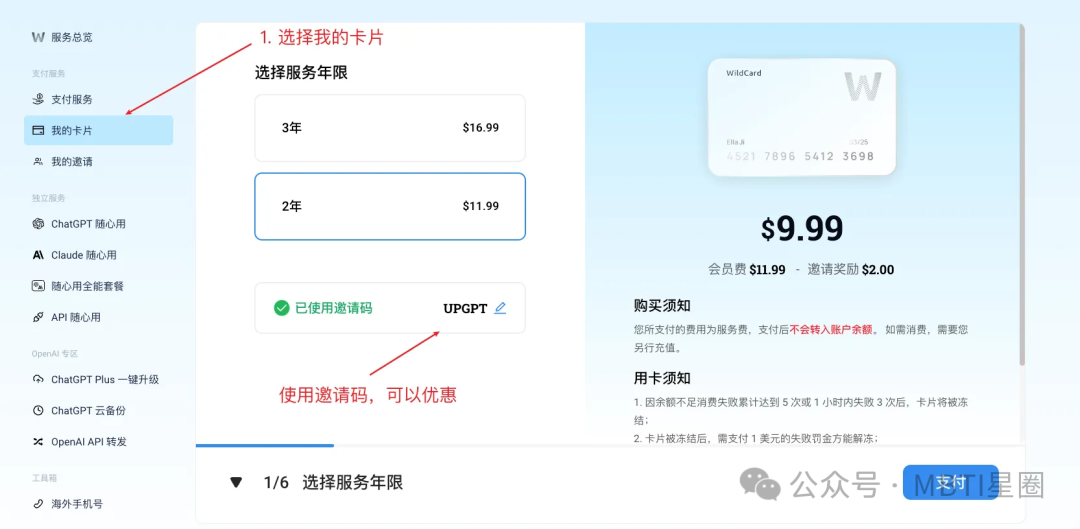 3、进入后台,点击左侧导航栏中的“我的卡片”,选择卡片使用期限,并扫码支付虚拟信用卡年费,建议选择2年,费用较为合理。