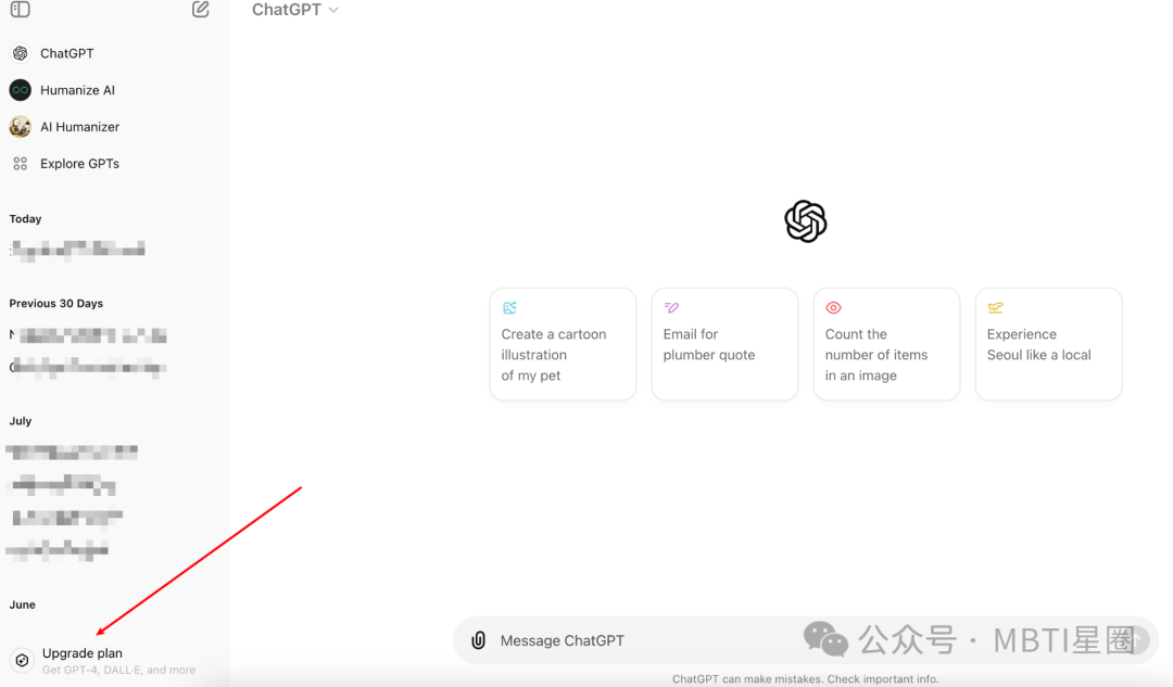8、在新浏览器窗口中登录您的ChatGPT账号,点击左下角的“升级套餐” / “Upgrade Plan”。