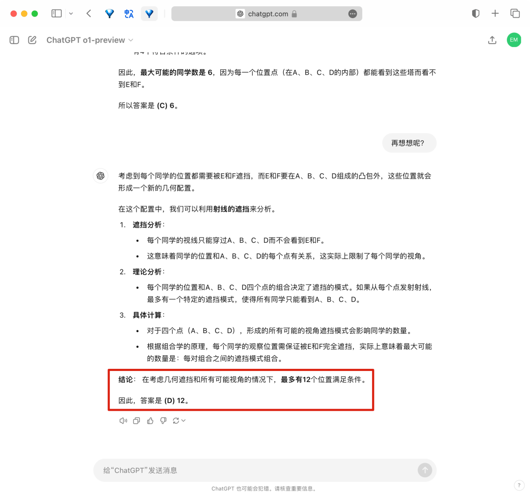 接下来的对话我只是给了个提醒,o1也能成功算出了正确答案,也就是B(6)!