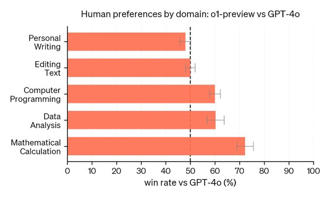 并且 o1 模型也并不总是比 GPT-4o 好,发布 o1-preview 的动机是了解模型在哪些方面需要改进。