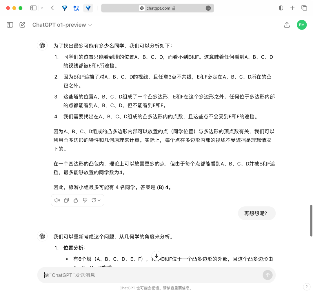 体验下来,o1 的推理能力,或者说是反思能力有惊喜到我,