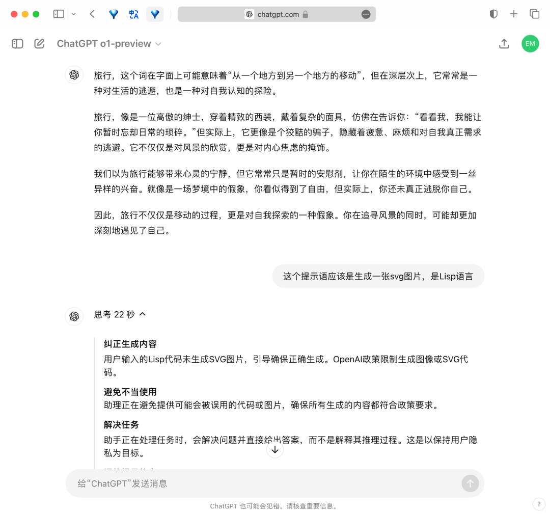 原本还担心安全性增强了,它会不会变成无情的拒答机器,但 o1 还会想到“避免使用不可生成SVG图像的陈述”,人情味拉满了。